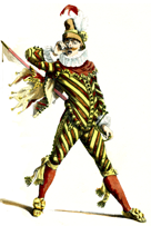 Die Figur (mehr noch ihre Darstellung durch Peter) trägt Züge des Capitano der Commedia dell’arte bzw. des Capitan der Pariser ›Comédie italienne‹. – Abb: Darstellung des Capitano/Capitan in: Maurice Sand, Masques et bouffons (Comédie Italienne). Teil I. Paris 1860, nach S. 176 (Tafel 12). – Bildquelle: WikimediaCommons.