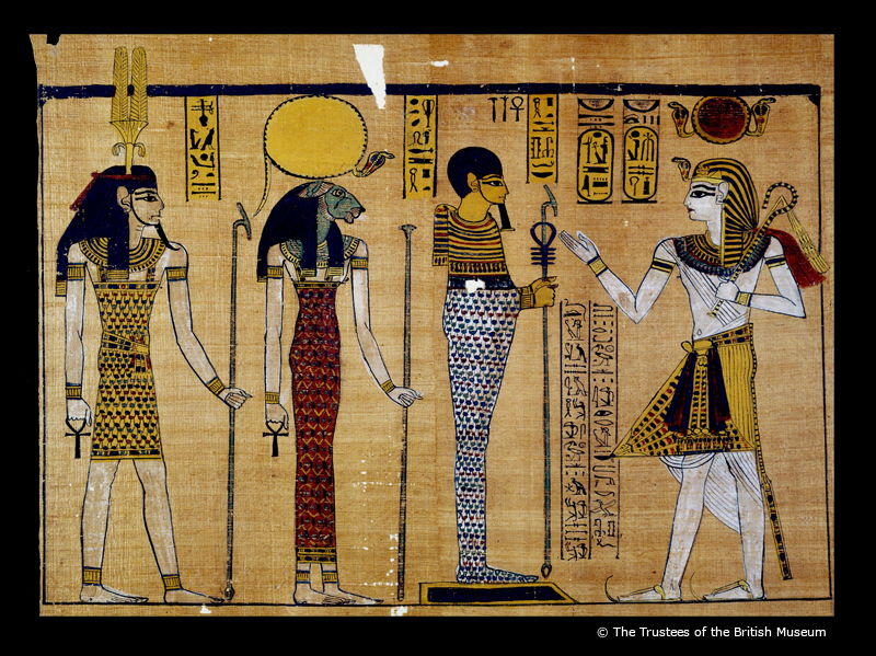 Die dritte Tafel des ›Großen Papyrus Harris‹ zeigt Pharao Ramses III. (1184-1153 v. Chr.) im vollen Königsornat (rechts), der die