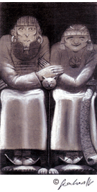 Robert Gernhardt, der mir wenige Monate vor seinem Tod die Erlaubnis gab, seine zeichnerischen Kabinettstückchen aus dem »Randfigurenkabinett des Doktor Thomas Mann« für das Thomas-Mann-Figurenlexikon zu verwenden, hat zum Joseph-Roman nur eine Zeichnung hinterlassen. Immerhin zeigt sie aber, wie er in einem Spiegel-Interview im August 2005 anlässlich der Ausstellung seines ›Randfigurenkabinetts‹ im Lübecker Buddenbrookhaus (August/September 2005) wissen ließ, seine Lieblings-Randfiguren: Huij und Tuij, die »greisen und inzestuösen ›Ehegeschwister‹«, die Eltern des ›Titelgemahls‹ Potiphar, denen Joseph einen Nachmittag lang als Stummer Diener zur Verfügung stehen muss. »In dem Alter noch so viele Kosenamen draufzuhaben: Mein Sumpfbiber, meine Rohrdommel, mein Fröschchen, meine liebe Erdmaus«, fand er »beachtlich – und sehr komisch«.